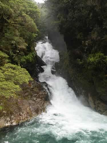| The drive for Milford Sound takes about 2½ hours by car. It's a windy road through mountains, along rivers and creeks, and by many spectacular waterfalls. Since we needed to be at the town of Milford Sound by noon, we kept the number of stops to a minimum on the way there. Further, the weather was not particularly cooperative for picture taking, so that seemed like a prudent measure. | |